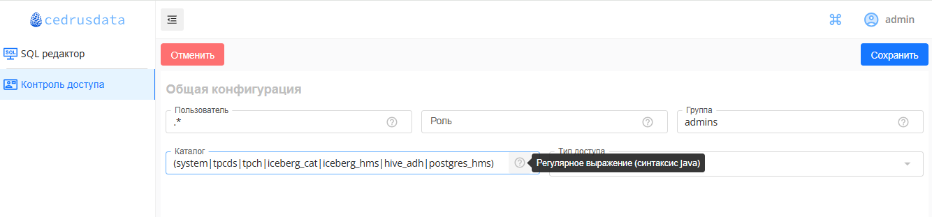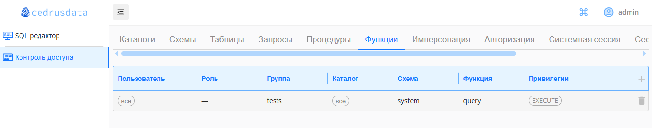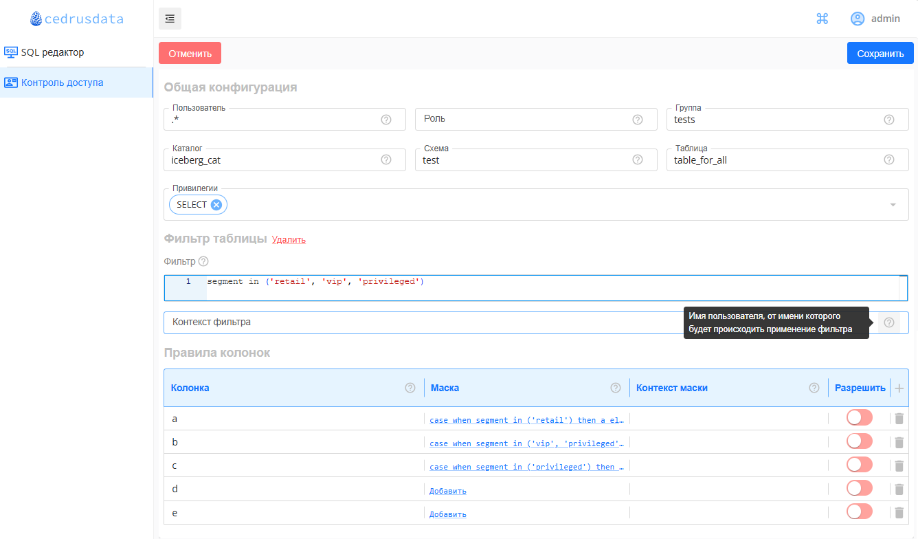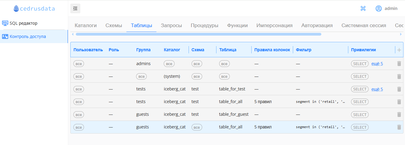 Ниже приведены примеры интерфейса настройки контроля доступа в CedrusData UI для некоторых закладок: